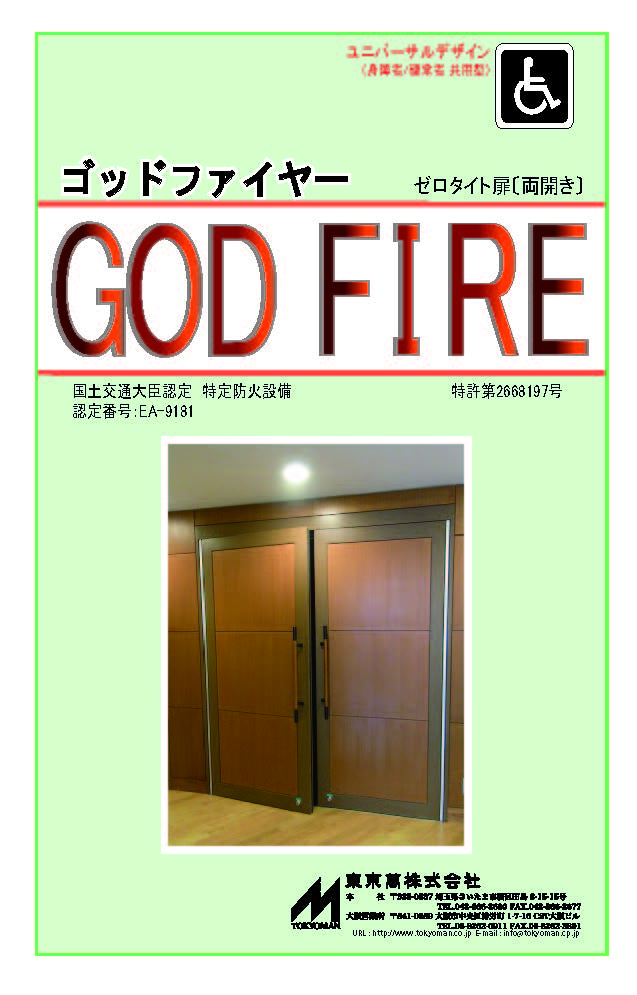 - 国土交通大臣認定品(個別認定品)「ゴッドファイヤー」は、特定防火設備(60分耐火)と遮音性能T-3等級(35dB)を兼ね備えたユニバーサルデザインの鋼製両開き防火防音扉です。